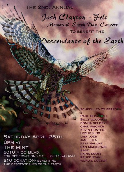 The 2nd Annual Josh Clayton-Felt Memorial Earth Day Concert to Benefit the Descendants of the Earth will be held at the Mint in Los Angeles (6010 W. Pico Blvd.) at 8 pm on Saturday, April 28th.